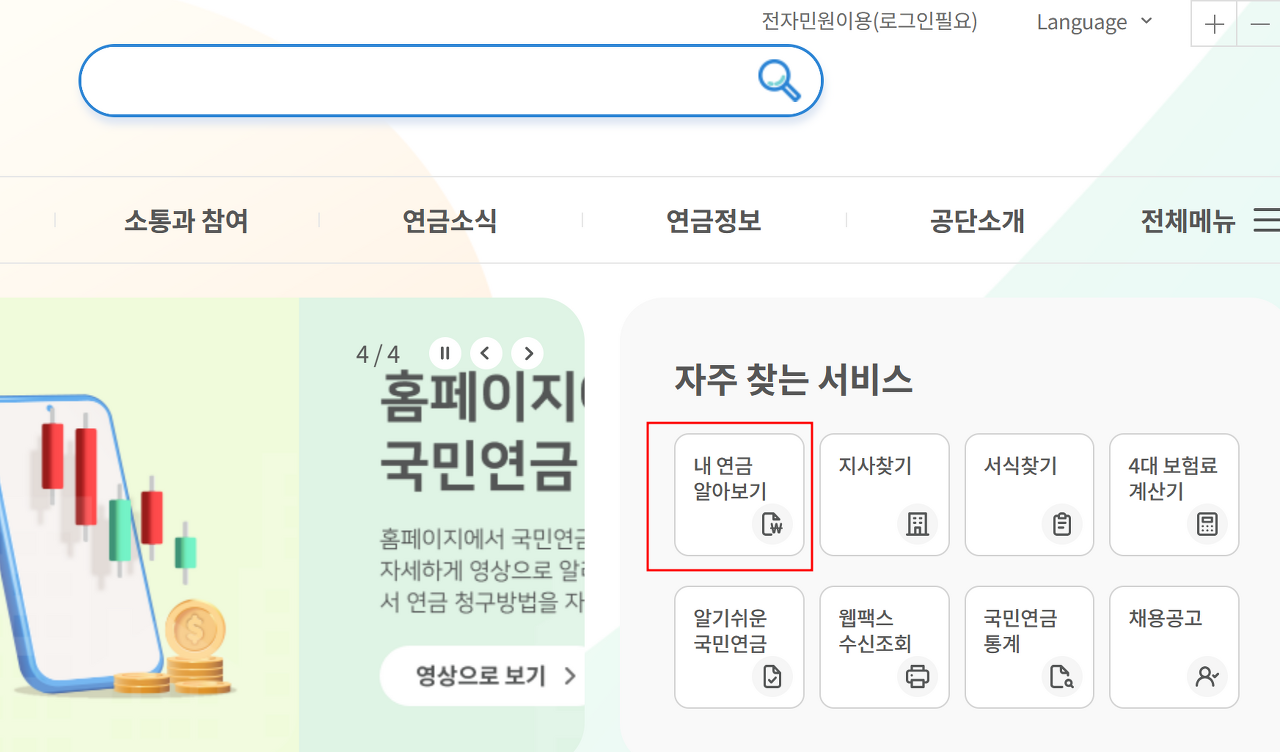 홈페이지에 접속한 후, '내 연금 알아보기'를 클릭하십시오. 예상되는 연금을 단순 계산만 원한다면 별도로 로그인할 필요가 없습니다. 예상 연금을 확인하고 싶으시다면 로그인하십시오.