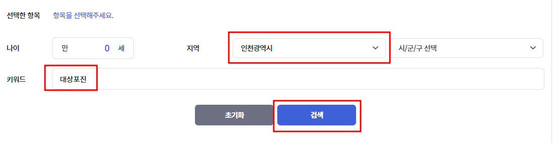 - 거주지역을 선택하고 키워드란에 '대상포진' 입력 후 검색 선택.