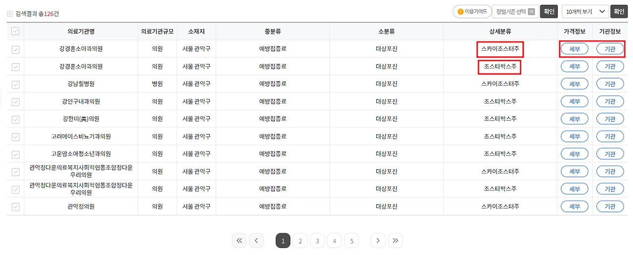 - 검색결과에서 가격정보탭에 '세부'를 선택하여 해당 의료기관의 예방접종 비용가격을 확인(해당지역 동일규모의 중간금액도 확인 가능).