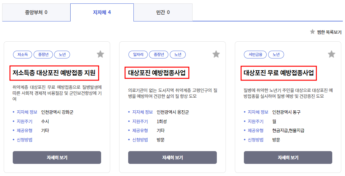 - 해당 지자체의 대상포진 무료접종 결과 확인(해당 지자체에 관련 사업이 없는 경우도 있음).