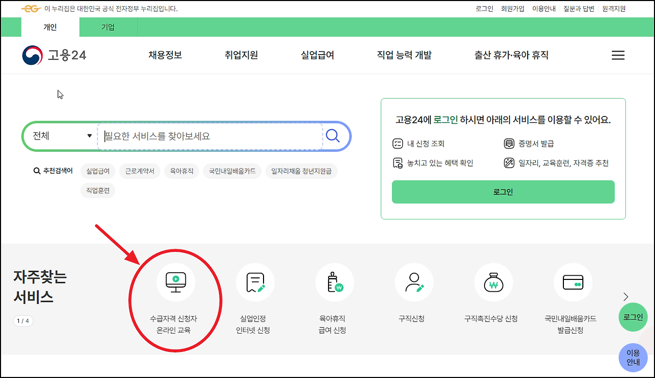 로그인 후 메인 화면에서 ‘수급자격 신청자 온라인교육’ 메뉴를 선택하면, 교육 페이지로 이동할 수 있습니다. - 교육 과정 신청