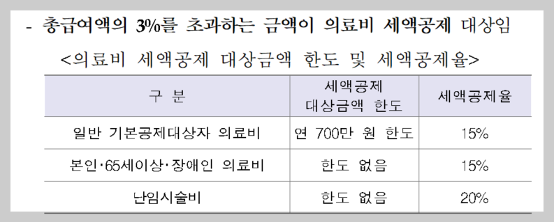 - 의료비 공제는 총 급여액의 3%를 초과하는 금액부터 가능합니다. 따라서 맞벌이 부부는 급여가 적은 측에게 몰아주는 것이 세액 감면을 최대화하는 전략 중 하나입니다.