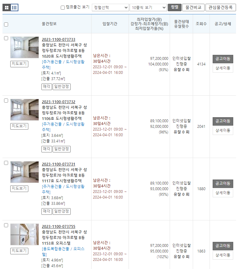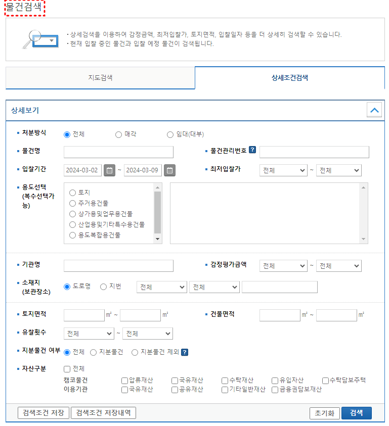 온비드 홈페이지에 회원가입하지 않더라도 공매물건 조회와 입찰 결과 등의 다양한 서비스를 이용할 수 있습니다. 예를 들어, 홈페이지 메인 화면에서 ‘용도별 검색’을 통해 부동산 항목에 들어가면 다양한 옵션으로 상세 검색을 진행할 수 있습니다. 검색 조건에 맞는 공매물건이 있다면, 공고 또는 상세 페이지로 이동하여 더 구체적인 정보를 확인할 수 있습니다.