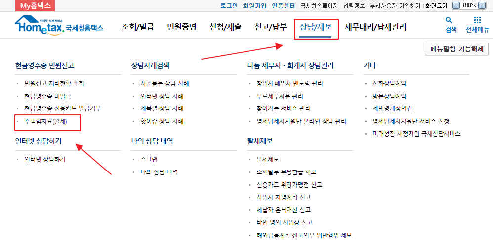 홈택스 웹사이트에 로그인 한 후, 상단의 상담/신고 메뉴를 선택하고 주택임대(월세) 메뉴를 클릭합니다. 그 다음 화면에서 임대인 정보, 계약 상세내용, 보증금, 월세 등을 입력한 후 첨부 문서와 함께 신청합니다.