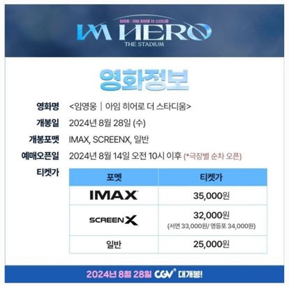 트로트 가수 임영웅의 콘서트 실황을 담은 영화 '아임 히어로 더 스타디움'이 2024년 8월 28일, CGV에서 개봉됩니다. 2024년 5월에 열린 서울월드컵경기장 콘서트를 바탕으로 제작된 이 영화는 임영웅의 팬들에게 특별한 경험을 선사할 것입니다. IMAX와 ScreenX 특별관에서 동시 개봉되며, 예매 일정과 방법이 공개되어 빠르게 매진될 것으로 예상됩니다.