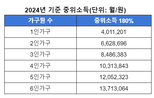 가구 구성원 수에 따른 중위소득 180% 이하인 경우 신청할 수 있습니다. 직전 과세기간의 소득이 확인되지 않는 기간에 소득이 확인되면, 전년도 소득으로 인정됩니다.