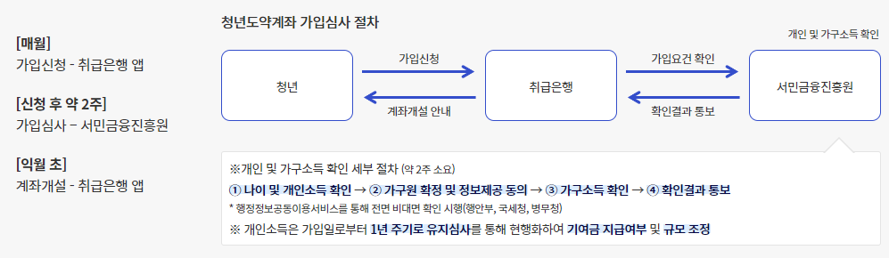 신청 방법은 은행 앱을 통해 청년 도약 계좌를 신청할 수 있으며, 신청 후 약 2주간 한국포용금융진흥원에서 회원 심사 과정을 거칩니다. 가입 요건이 확인되면 은행이 계좌 개설 안내를 해줍니다. 가입 신청 시 별도의 서류를 제출할 필요는 없지만, 정보가 확인되지 않을 경우 추가 자료 제출을 요청받을 수 있습니다.