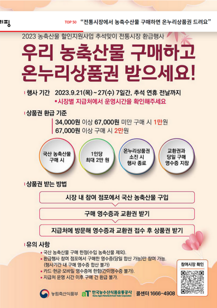 구매 영수증을 시장의 이벤트 부스에서 제시하시면, 구매 금액에 따라 10,000원 또는 20,000원의 온누리 상품권을 받으실 수 있습니다.