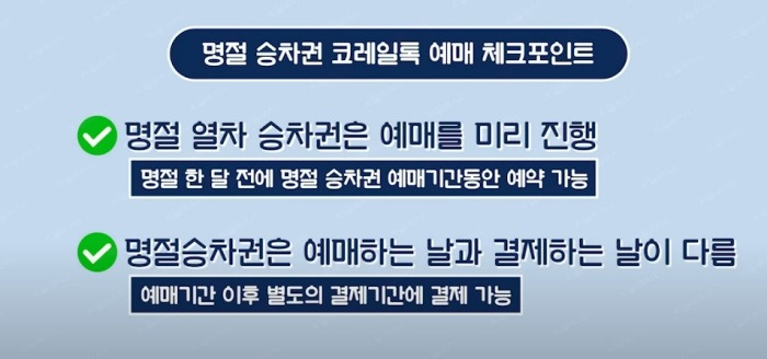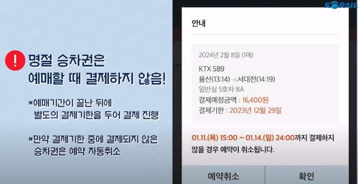 명절 승차권은 예매할 때 결제하지 않으므로, 결제 기간 내에 결제를 완료해야 합니다. 추석에 지방에 내려가야 하는 분들은 꼭 예매 날짜 및 시간을 확인하시어 예매하시기 바랍니다.