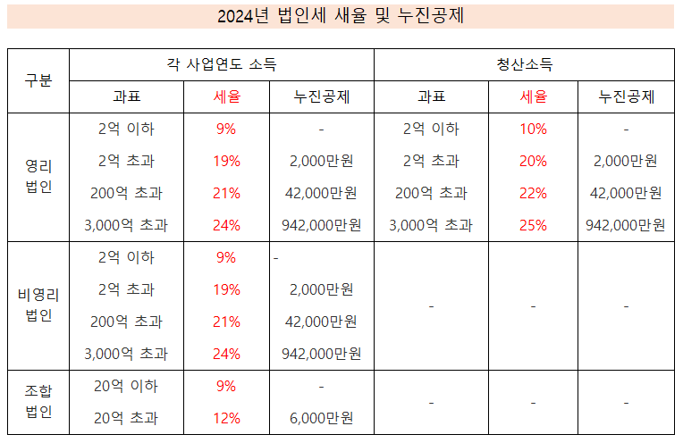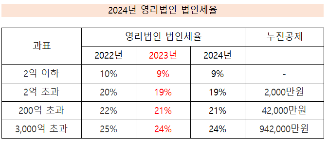 2024년 법인세율은 2023년에 비해 각 과세표준 구간별로 1%p씩 인하되어, 최저 9%에서 최고 24%의 세율이 적용됩니다.