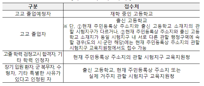 졸업생은 출신 고등학교에서 원서 접수를 진행합니다. 단, 고등학교 졸업자 중 주민등록상 주소지와 출신 고등학교 소재지의 관할 시험지구가 다르거나, 동일 시험지구 내 서로 다른 행정구역에 속하는 경우에는 현재 주민등록상 주소지의 관할 시험지구 교육지원청에서도 접수할 수 있습니다.