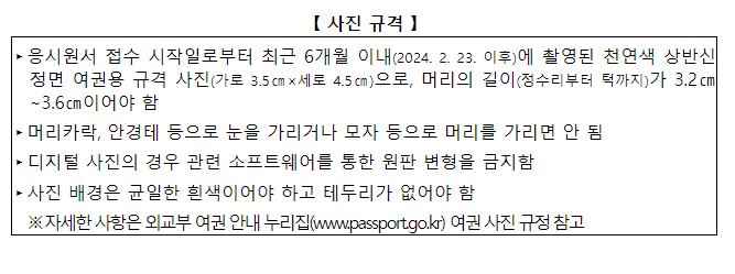 - 규격 사진 (최근 6개월 이내 촬영한 여권용 사진)